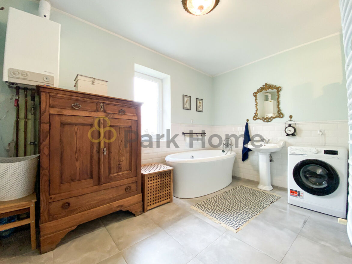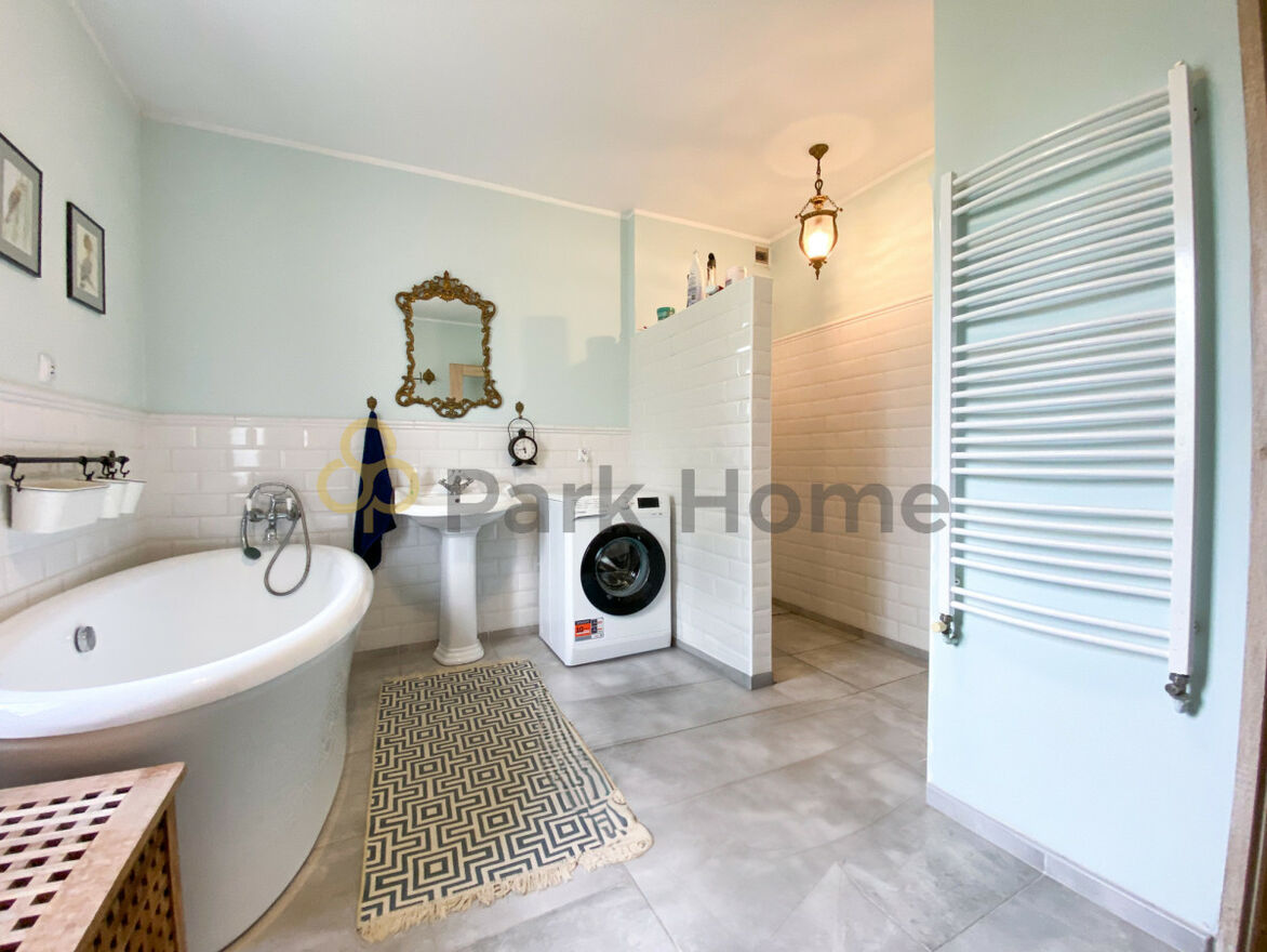 - spora łazienka z wanną, miejscem na pralkę i zabudowaną kabiną prysznicową
